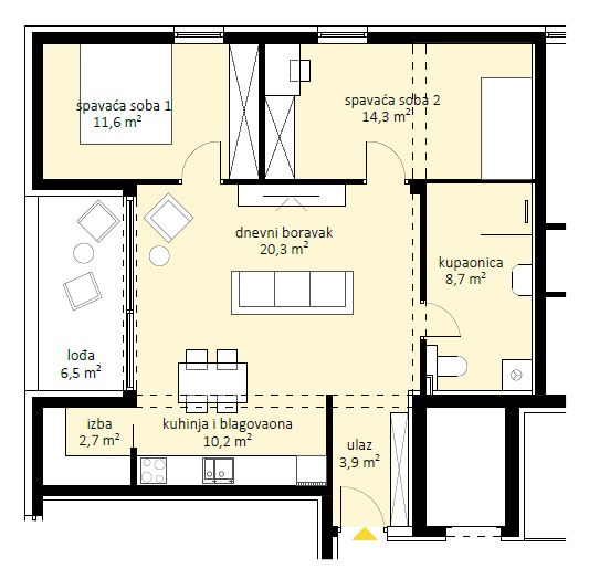 Ovaj prostrani stan u prizemlju, s površinom od 76,58 m², predstavlja savršenu kombinaciju prostora i privatnosti. Stan nudi dnevni boravak s izlazom na lođu, povezan s modernom kuhinjom i blagovaonicom, idealan za opuštanje i druženja. Velike staklene površine osiguravaju obilje prirodnog svjetla, stvarajući ugodnu atmosferu. Također, nudi dvije spavaće sobe te kvalitetne sanitarije, dok su svi elementi dizajnirani tako da osiguraju maksimalnu udobnost i estetsku privlačnost. Također, u stanu se nalazi i izba koja dodaje značajnu vrijednost jer nudi praktičan prostor za odlaganje i organizaciju. Uz dodatnu sigurnost video nadzora i osigurano spremište u podzemnoj garaži, ovaj stan predstavlja savršeno mjesto za život u skladu s modernim standardima.