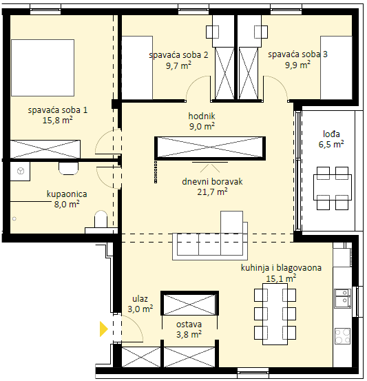 može ući sa strane gdje se nalazi ulaz te sa strane gdje je kuhinja što doprinosi pružanju
